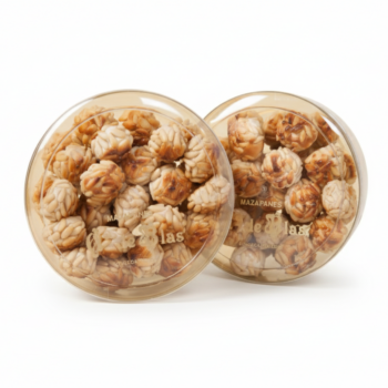 Antigua y tradicional elaboración del mazapán. Rellenas de yema confitada y mermelada de albaricoque, decoradas manualmente con azúcar glaseado y coloridas frutas escarchadas.